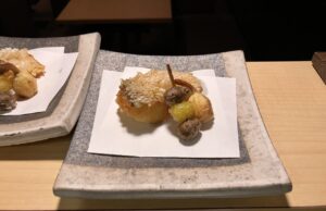 零余子と豆入り海老真薯と旬野菜の米粉揚げ
