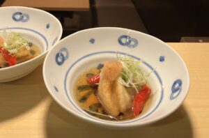 海老と枝豆・玉蜀黍の真薯 明日葉の天ぷら