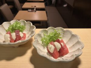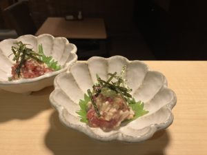 まぐろ、長芋、海苔、わさび、スタンダードな和の組み合わせですが味付けには意外なものが‥